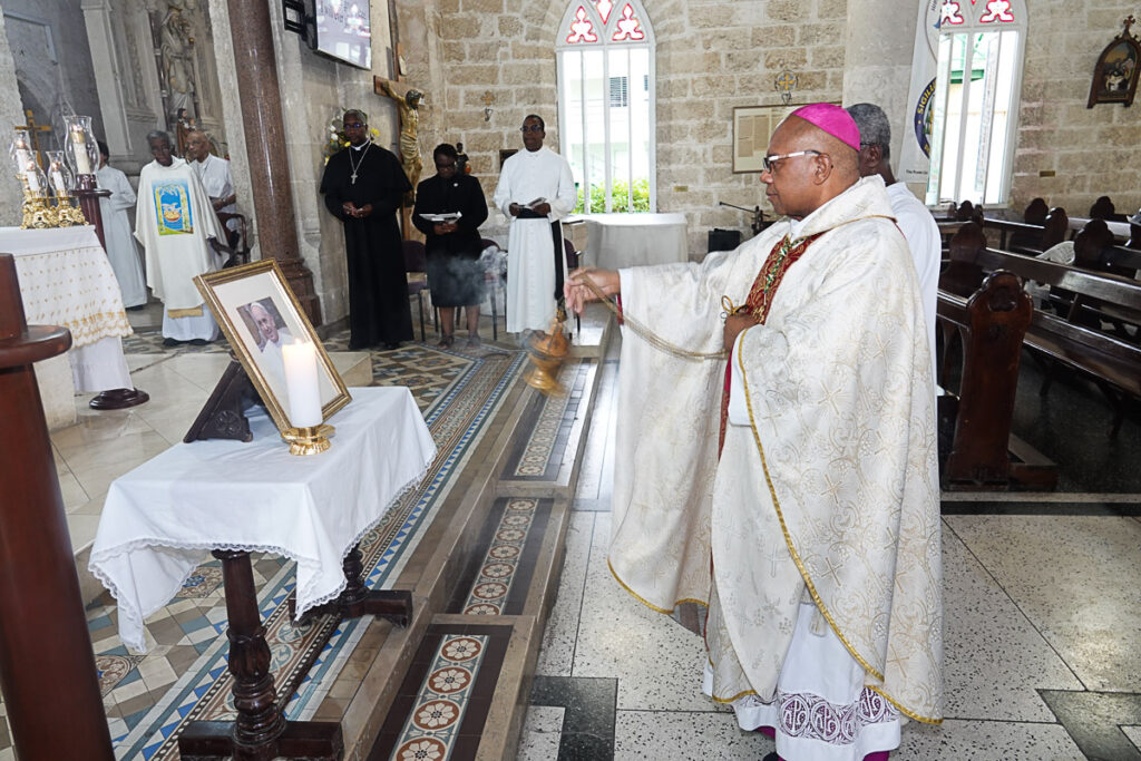 The Roman Catholic Bishop, Neil Scantlebury during the mass incensed a photo of Pope Francis. He was joined by clergy from other churches, Anglican Bishop of Barbados The Rt. Rev. Michael Maxwell, Moravian Rev Cicely-Athill Horsford and Anglican Priest Rev Dr. Michael Lashley